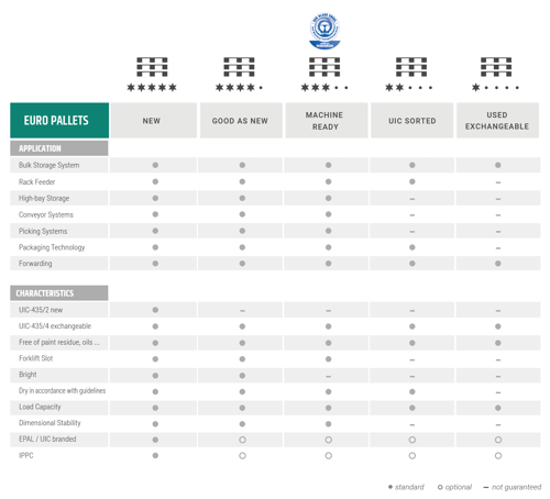 - Para los clientes que requieren una calidad media, recomendamos la denominada calidad «compatible con máquina»: palets especialmente bien clasificados y reparados. Este europalet premiado con la certificación alemana Ángel Azul —Blauer Engel, para productos y servicios respetuosos con el medio ambiente— es la solución ideal tanto desde el punto de vista comercial como ecológico.